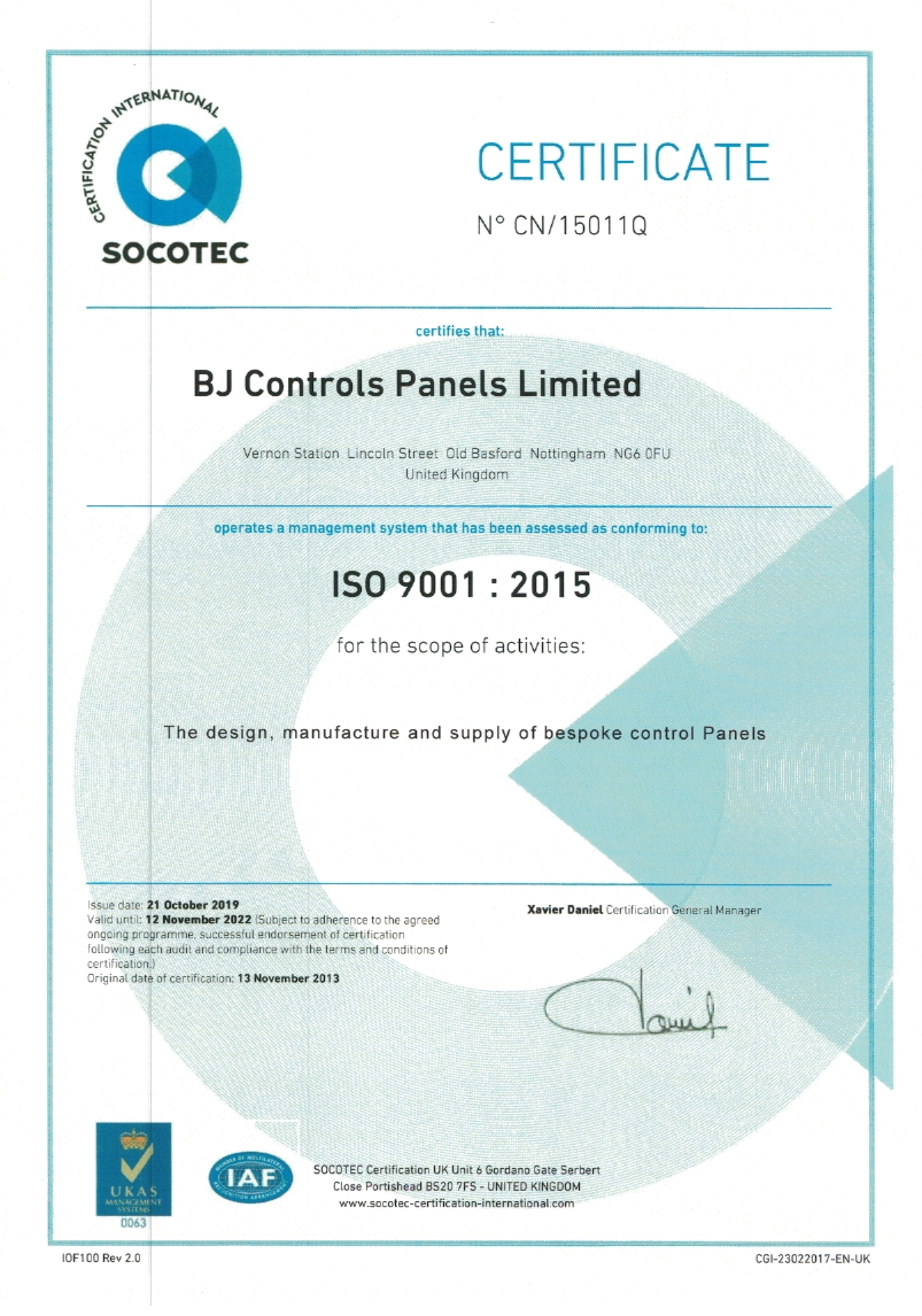 BJ Control Panels has recently been awarded certification to ISO9001:2015 for the design, manufacture and supply of bespoke control panels.
